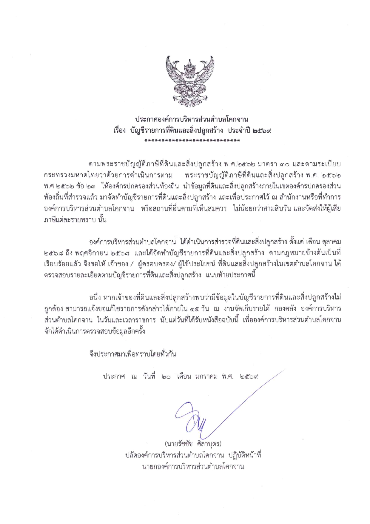 ประกาศเรื่องบัญชีรายการที่ดินและสิ่งปลูกสร้าง ประจำปี 2569